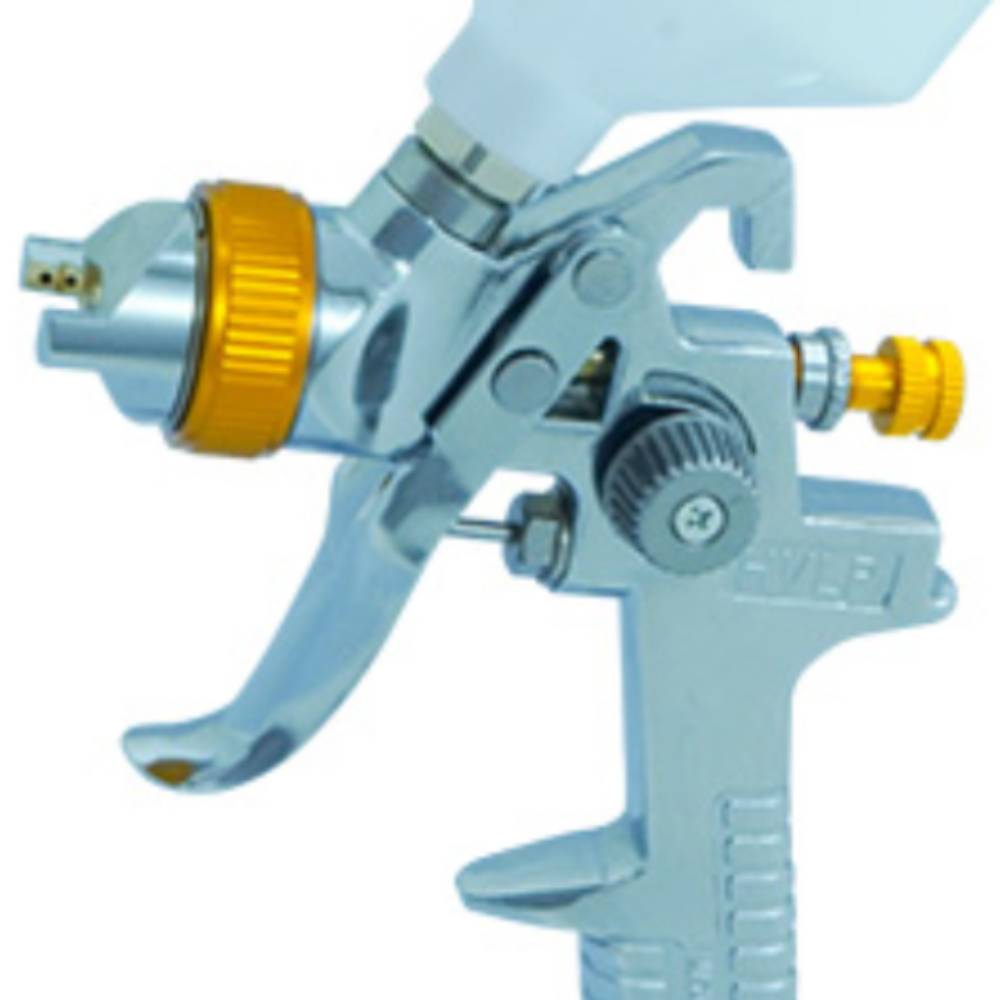 Pistola de pintura com tecnologia HVLP, alto volume e baixa pressão, que proporciona melhor acabamento final, melhor atomização da tinta em relação ao sistema convencional.